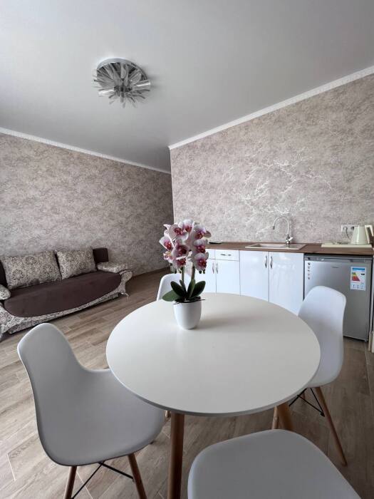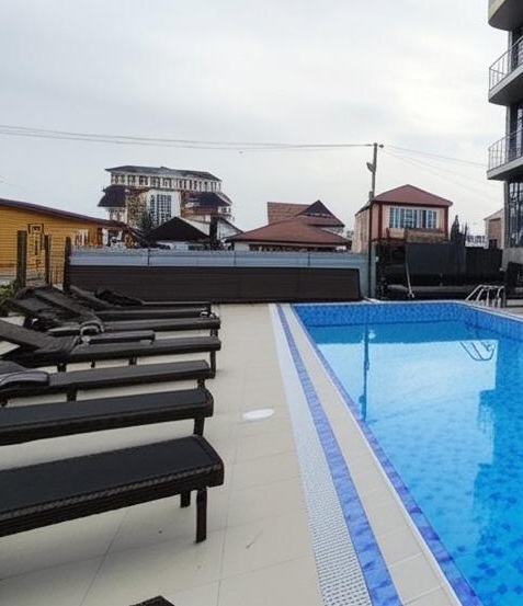 Экологичный дизайн с панорамными окнами и видом на бассейн. Бассейн большой, общий с гостиницей стоящей напротив. Кондиционеры, Wi-Fi, Smаrt-ТV, вся необходимая техника. Зона с шезлонгами, барбекю