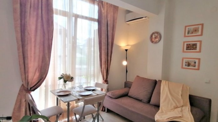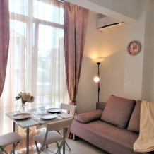 Апартаменты представляют собой евро-двушку (кухню-гостинную и изолированную спальню). В апартаментах своя кухонная зона со всем оборудованием для приготовления пищи, свой санузел с душевым отсеком. Вход в апартаменты отдельно с улицы.