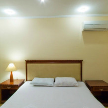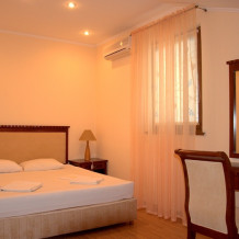 Номер с отдельным входом и индивидуальным балконом (бамбуковая мебель с видом на море и закат), находится на 2 этаже в отдельно стоящем здании. В номере двухспальная кровать, большой угловой раскладывающийся диван, холодильник, мини-кухня, СВЧ, электрочайник, LCD TV, спутниковое ТВ, кондиционер, санузел (душевая кабина, умывальник, туалет).