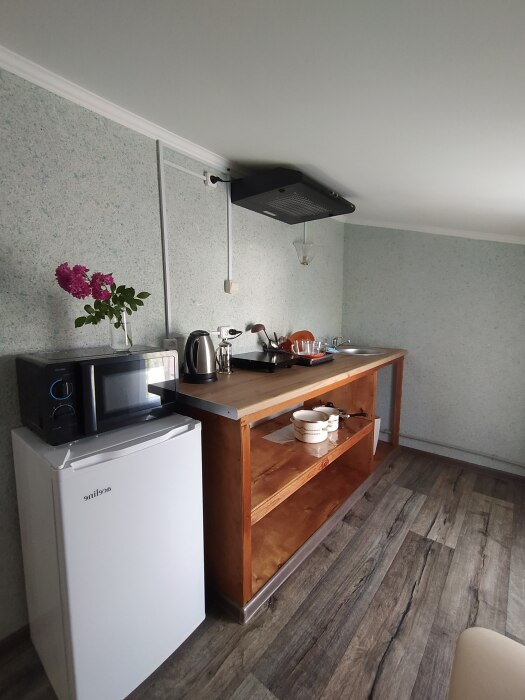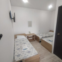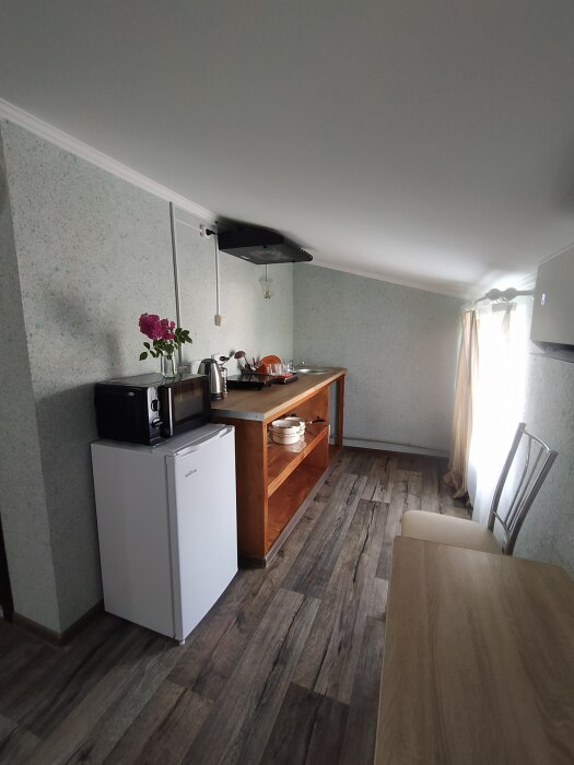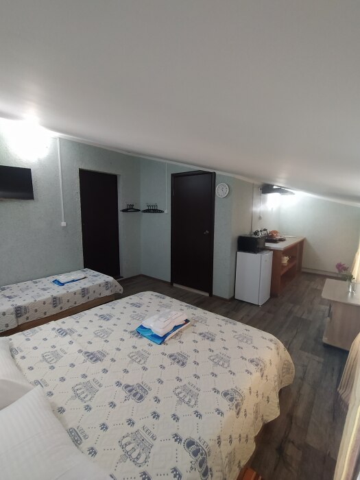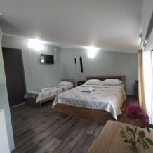 Номера с кухней, расположены на третьем этаже. В номере двуспальная кровать, односпальная кровать. Возможно поставить еще удобную раскладушку. Совсем маленьким гостям, предоставляется детская кроватка. Дети до 5 лет, без предоставления места, могут проживать бесплатно.
