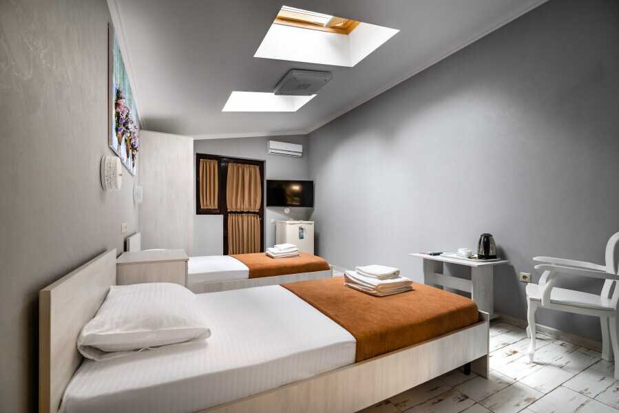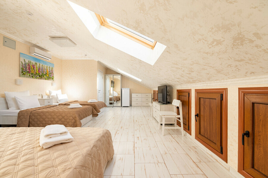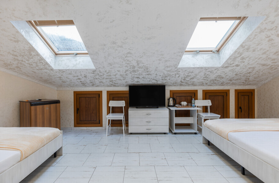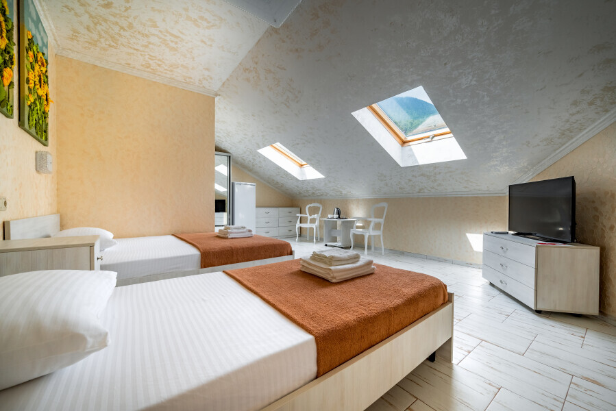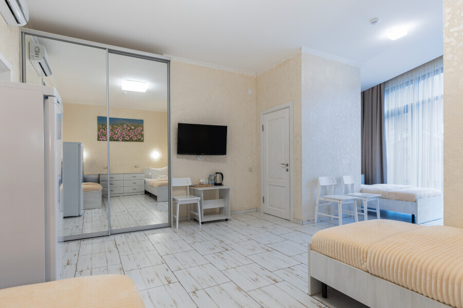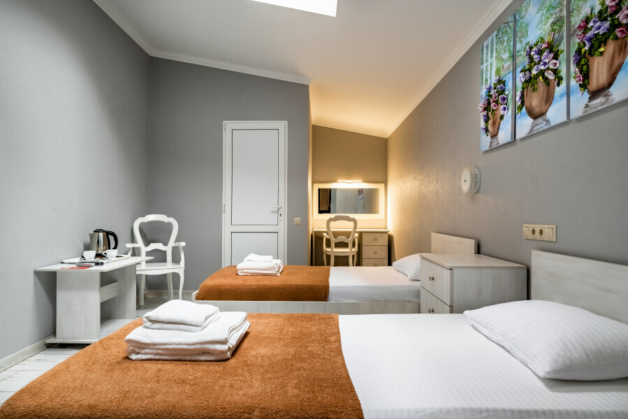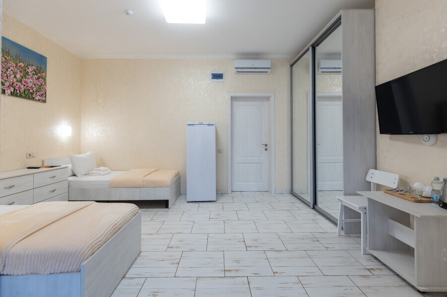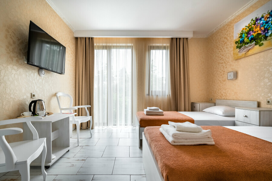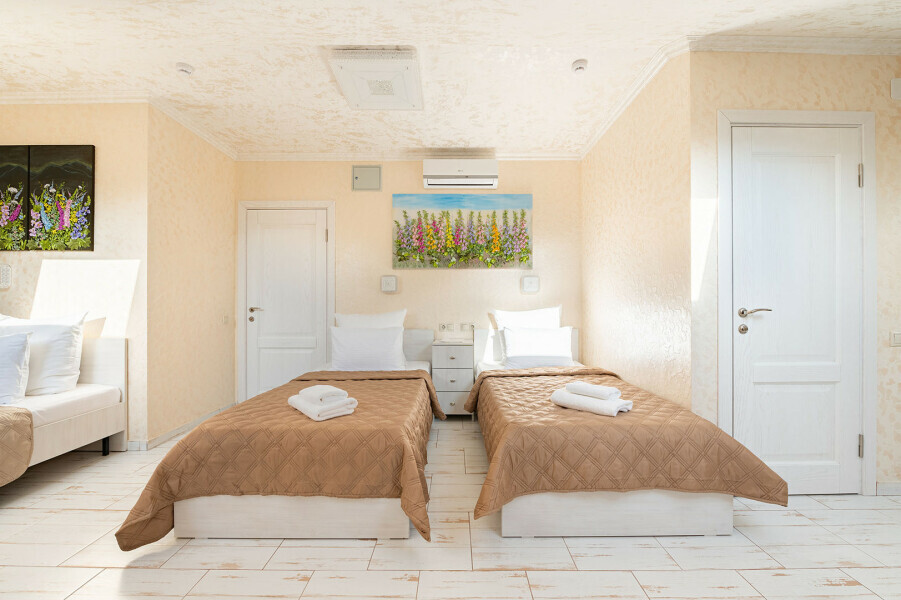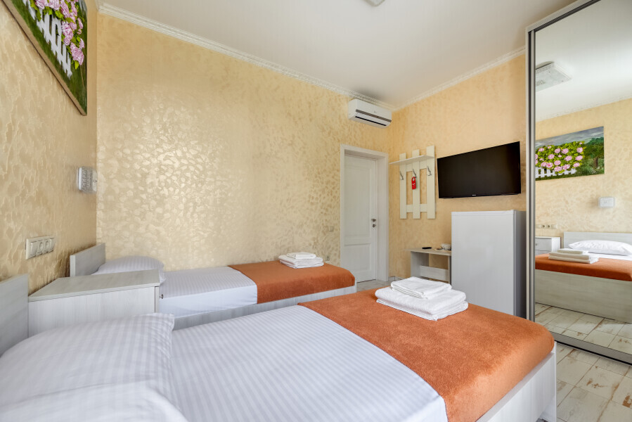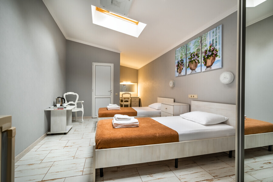 Две мягкие односпальные кровати и двухместный раскладной диван. Кондиционер, холодильник, ЖК телевизор и санузел с душем обеспечат ваше удобство. В номере есть журнальный стол и шкаф-купе.