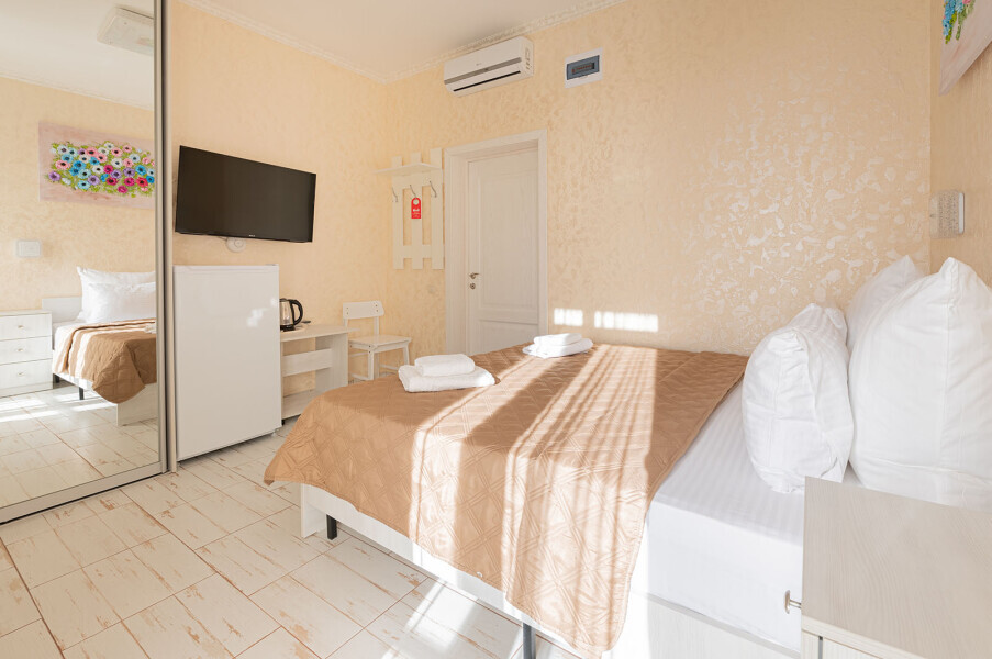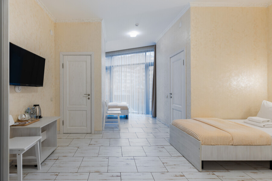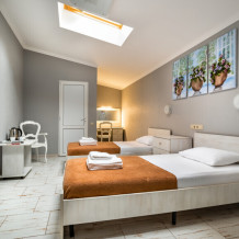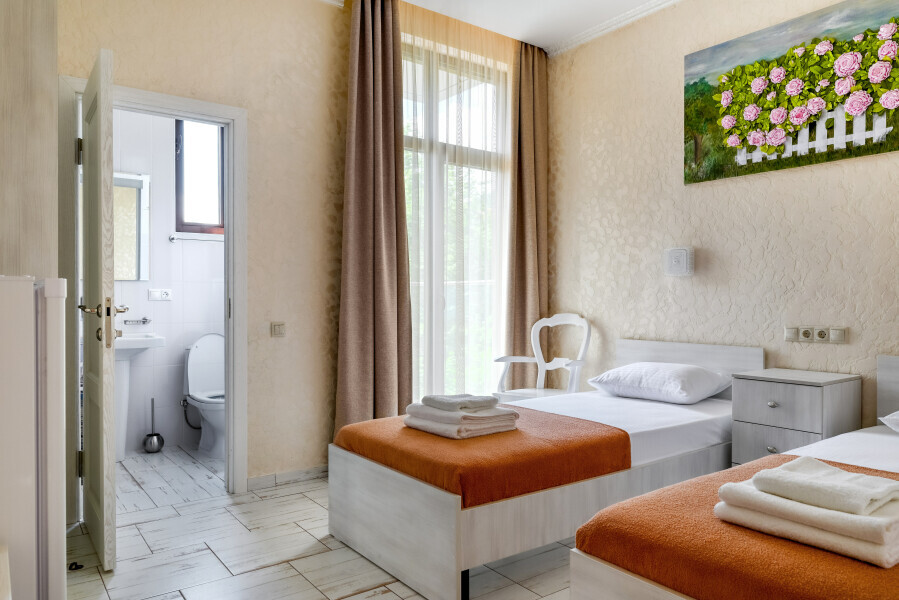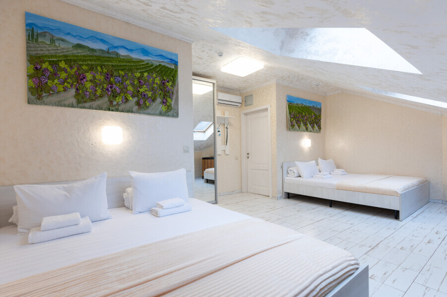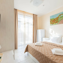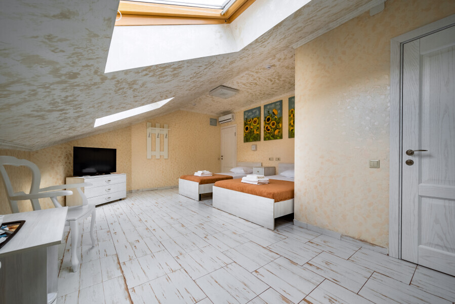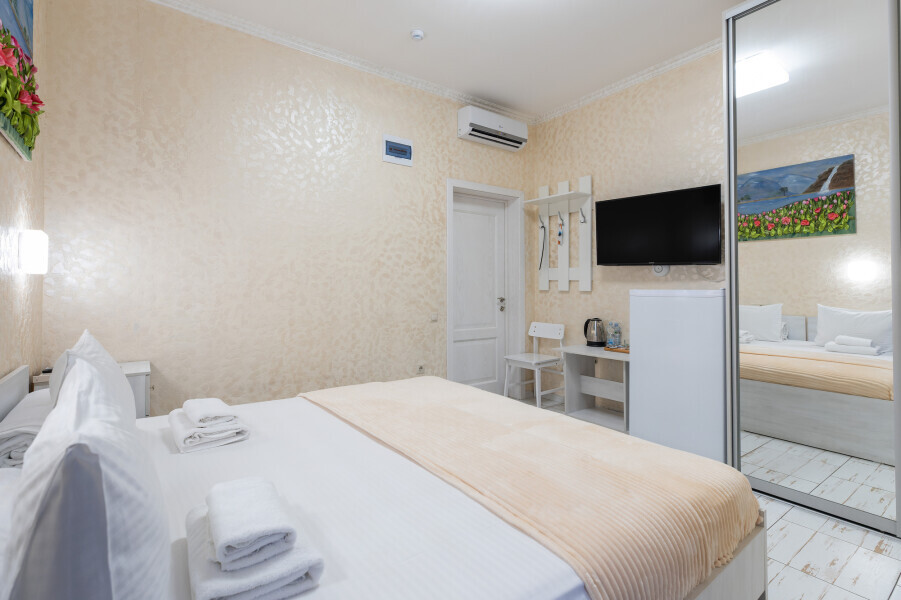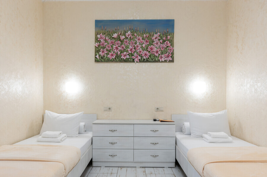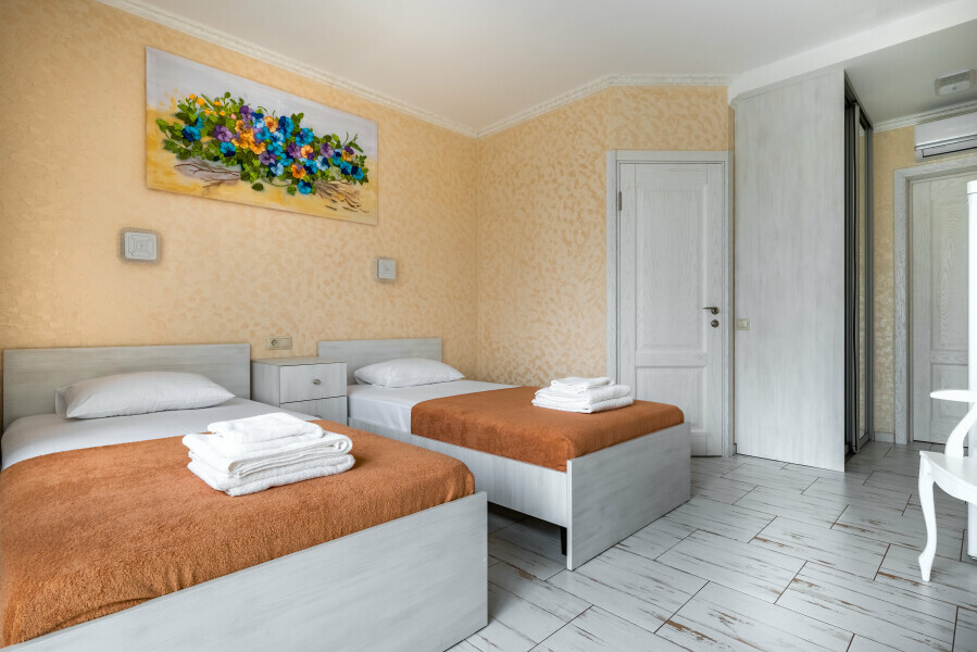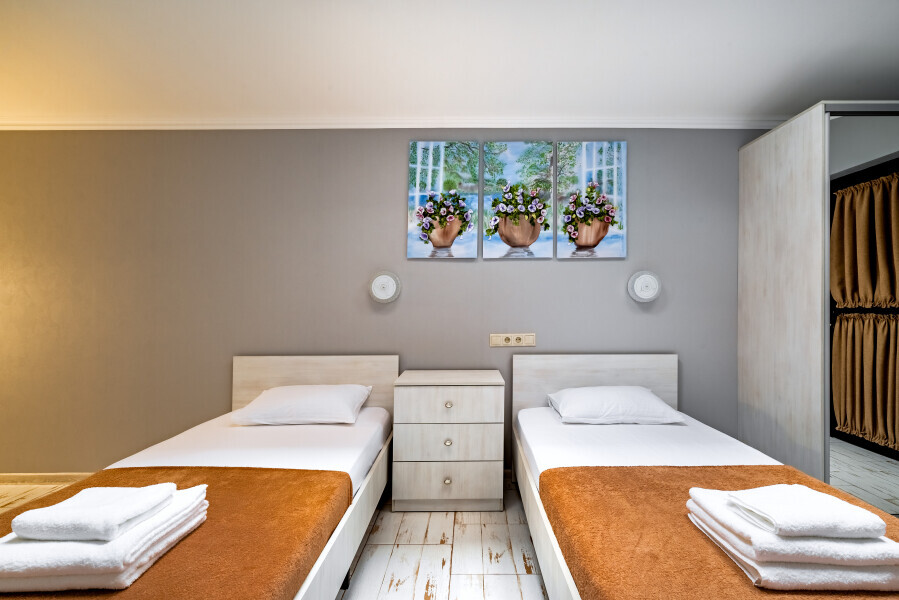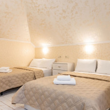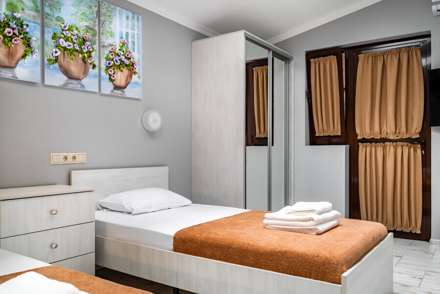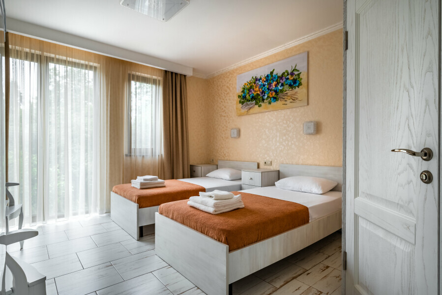 Две мягкие односпальные кровати и двухместный раскладной диван. Кондиционер, холодильник, ЖК телевизор и санузел с душем обеспечат ваше удобство. В номере есть журнальный стол и шкаф-купе.