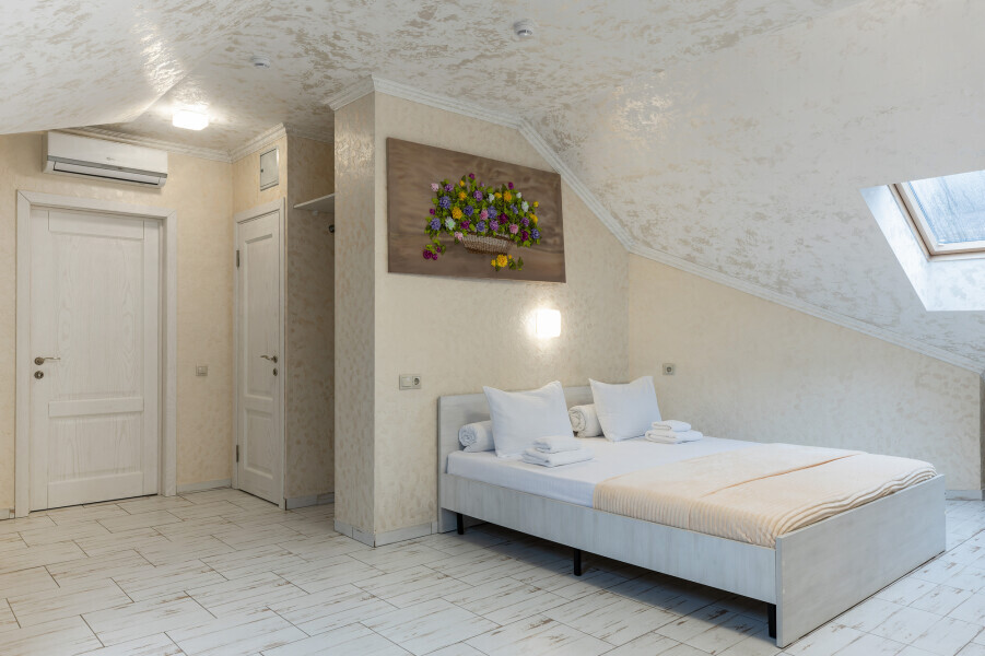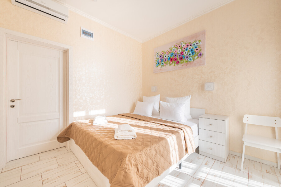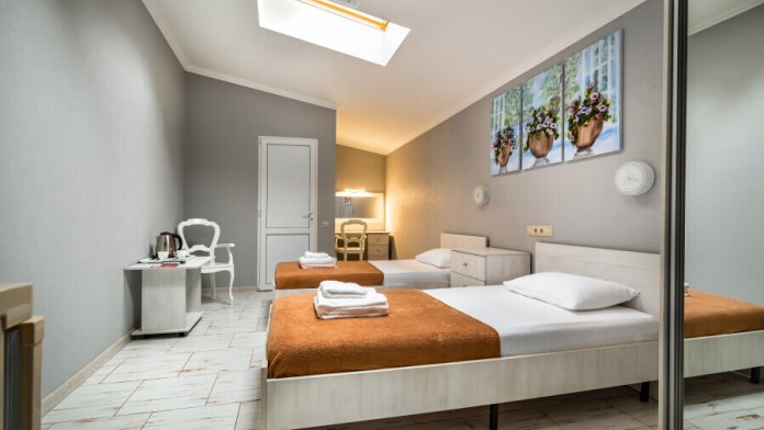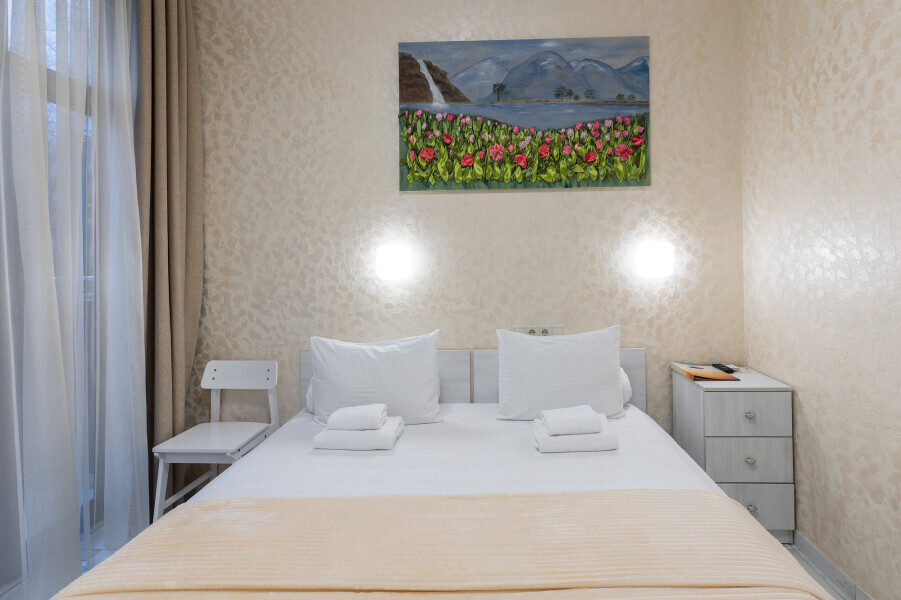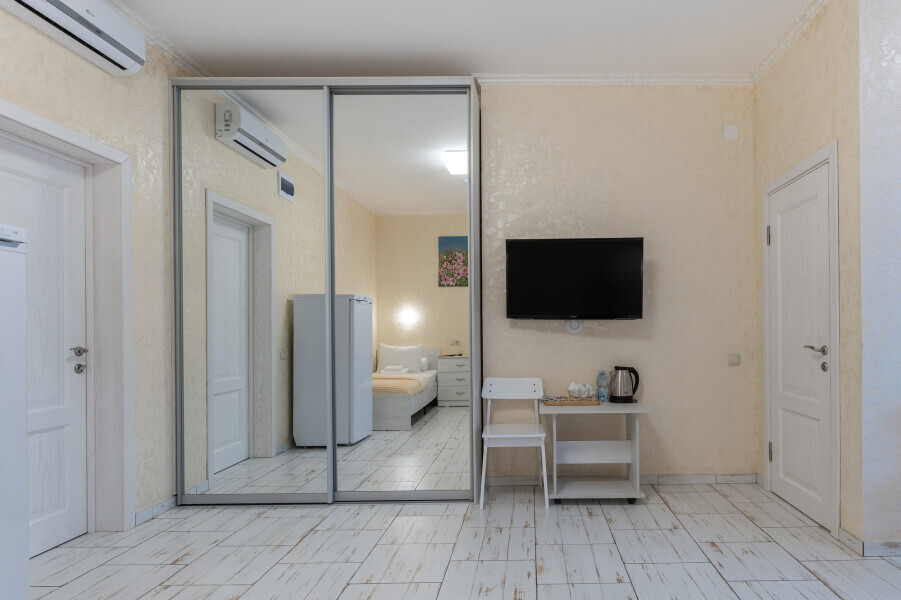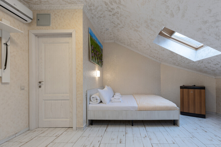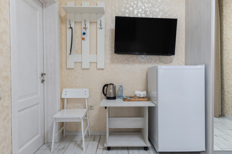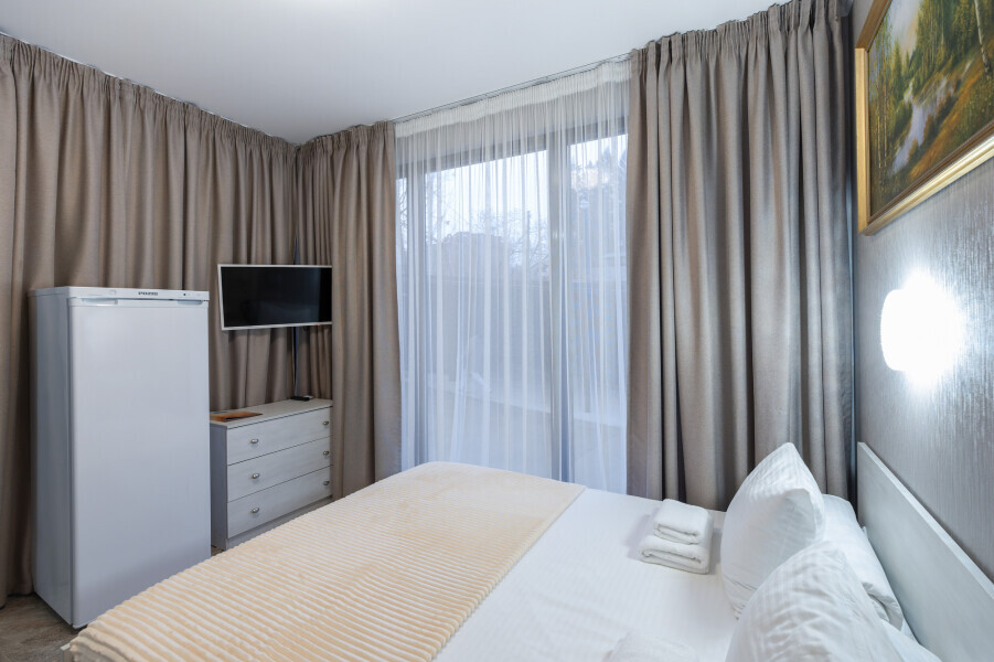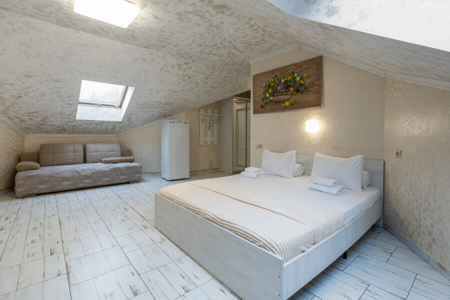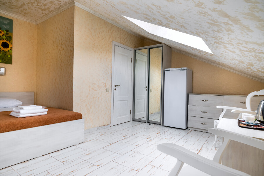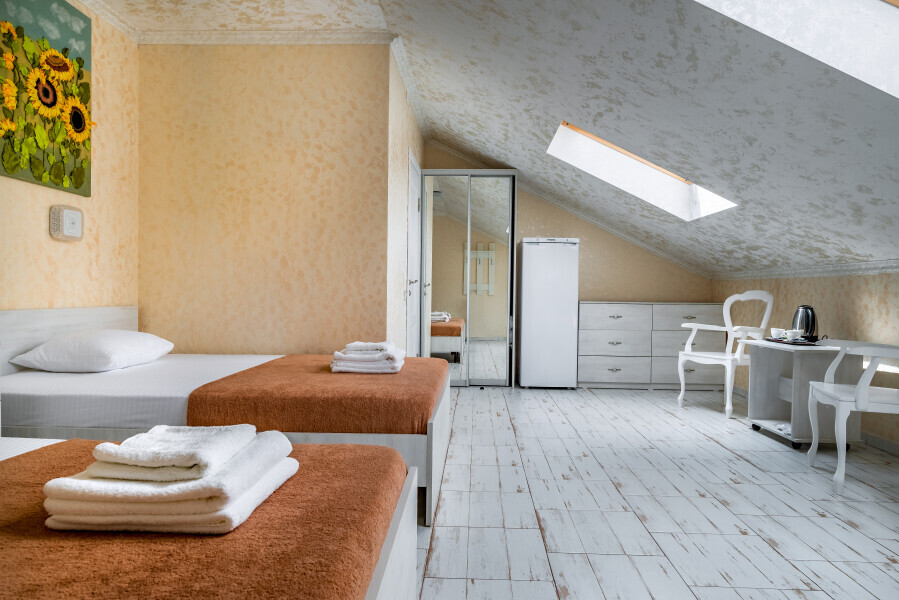 Две мягкие односпальные кровати и двухместный раскладной диван. Кондиционер, холодильник, ЖК телевизор и санузел с душем обеспечат ваше удобство. В номере есть журнальный стол и шкаф-купе.