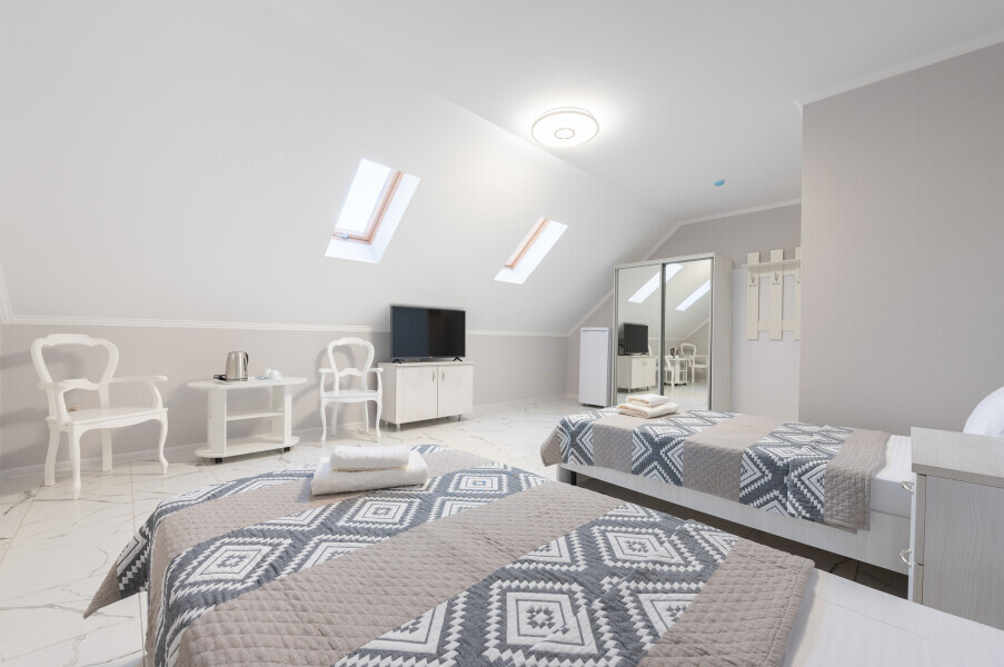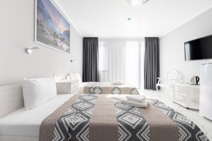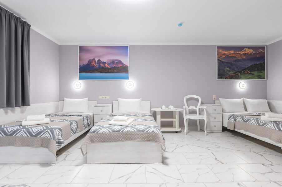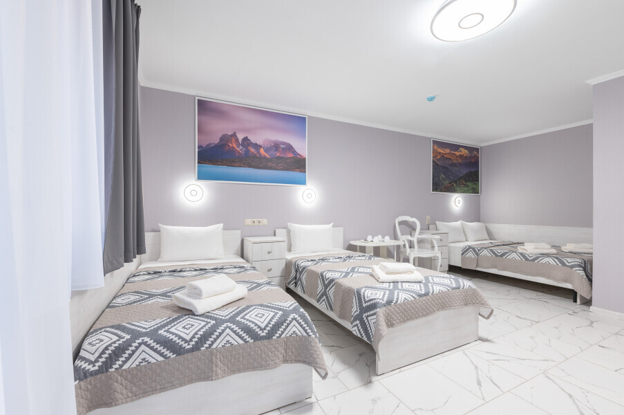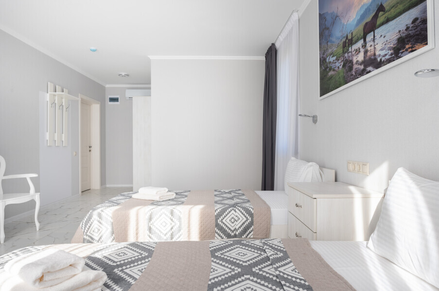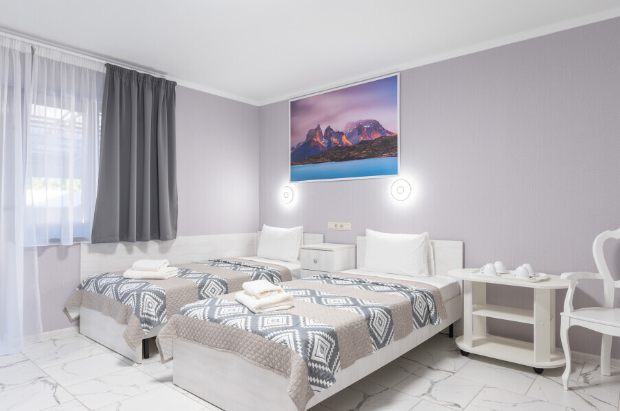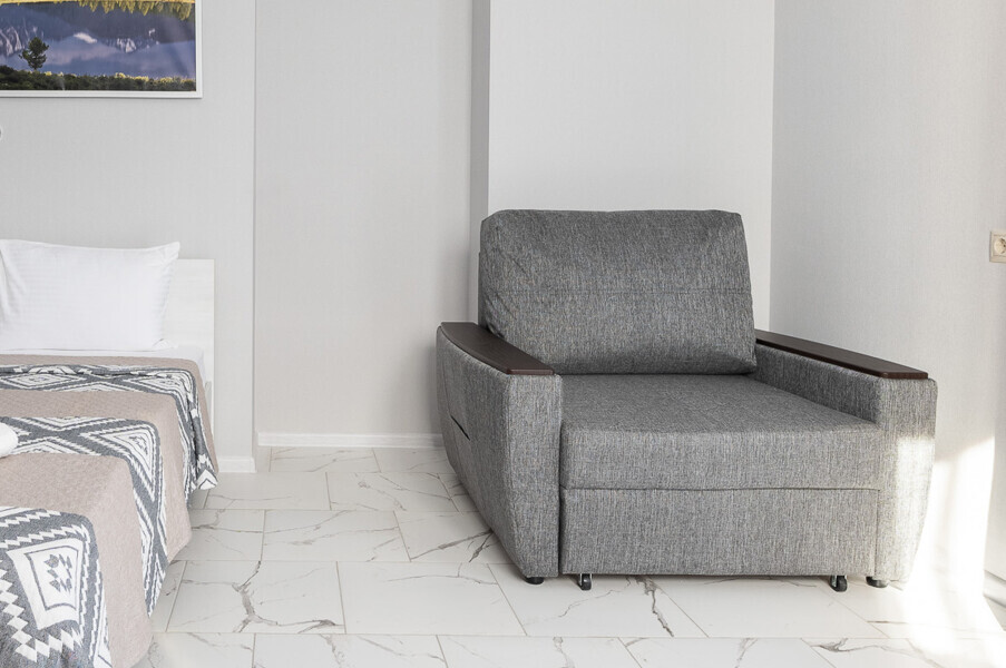 В номере: две односпальные или одна большая двуспальная кровать и кресло-кровать.