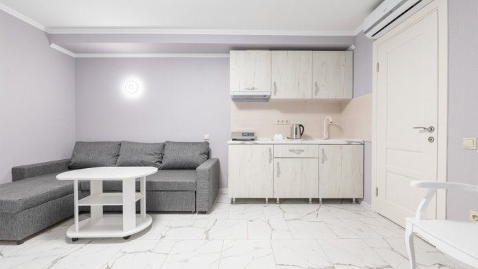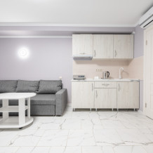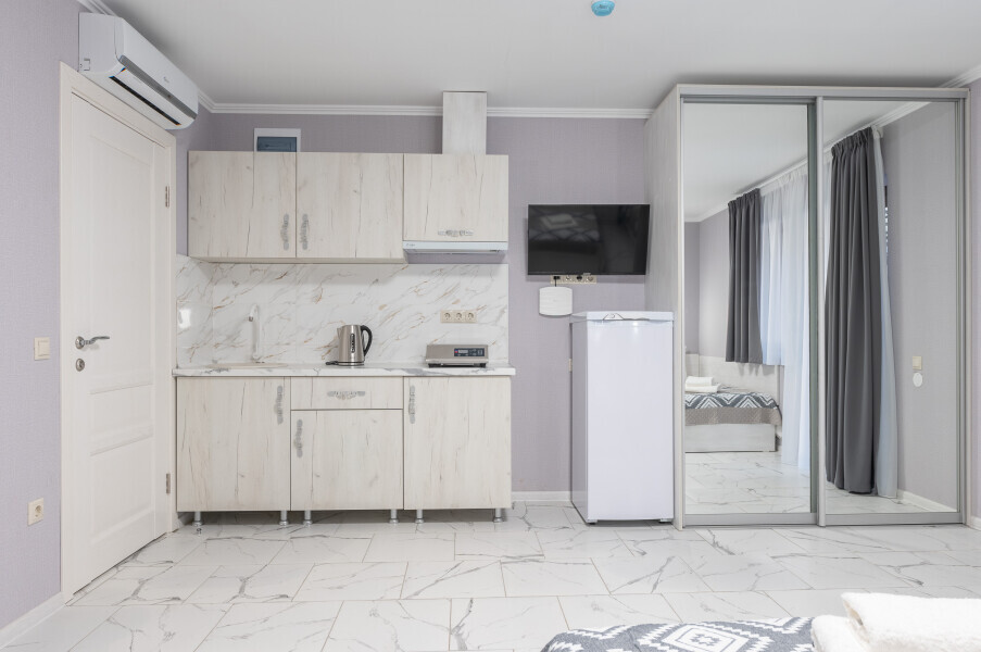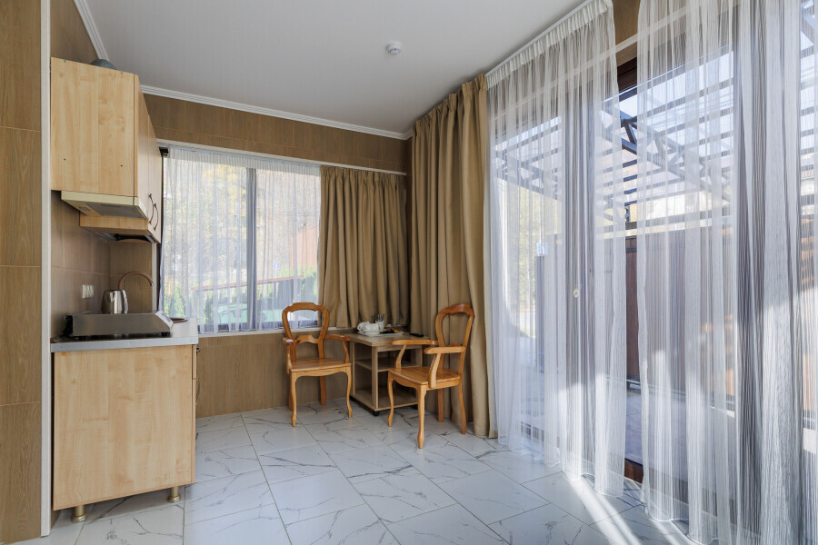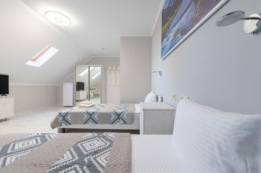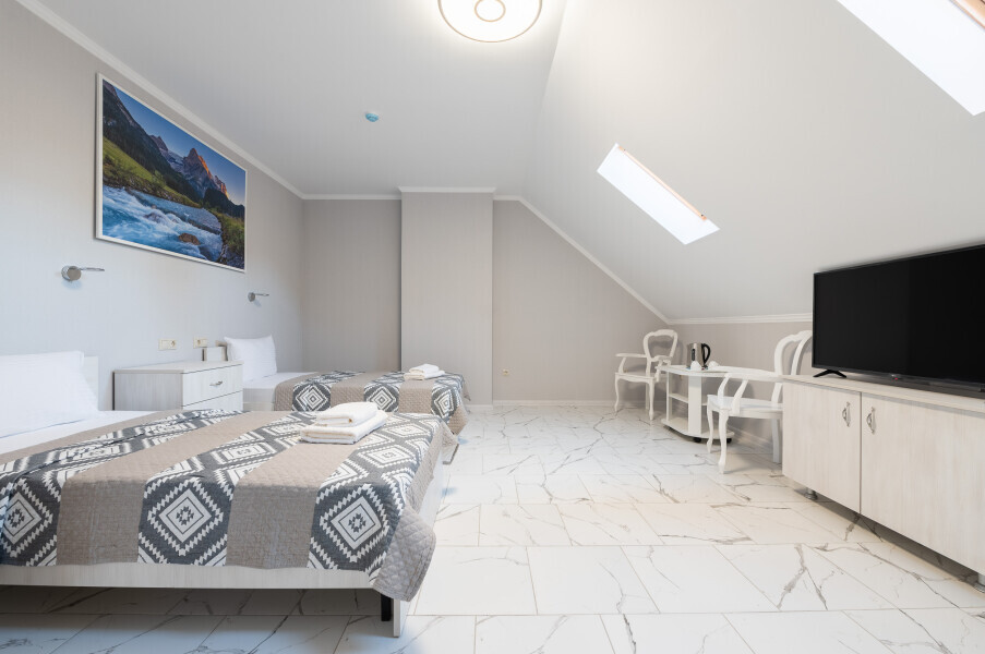 Две мягкие односпальные кровати и двуспальная кровать. Собственная кухонная зона, кондиционер, холодильник, ЖК телевизор и санузел с душем обеспечат ваше удобство. В номере есть журнальный столик и шкаф-купе.