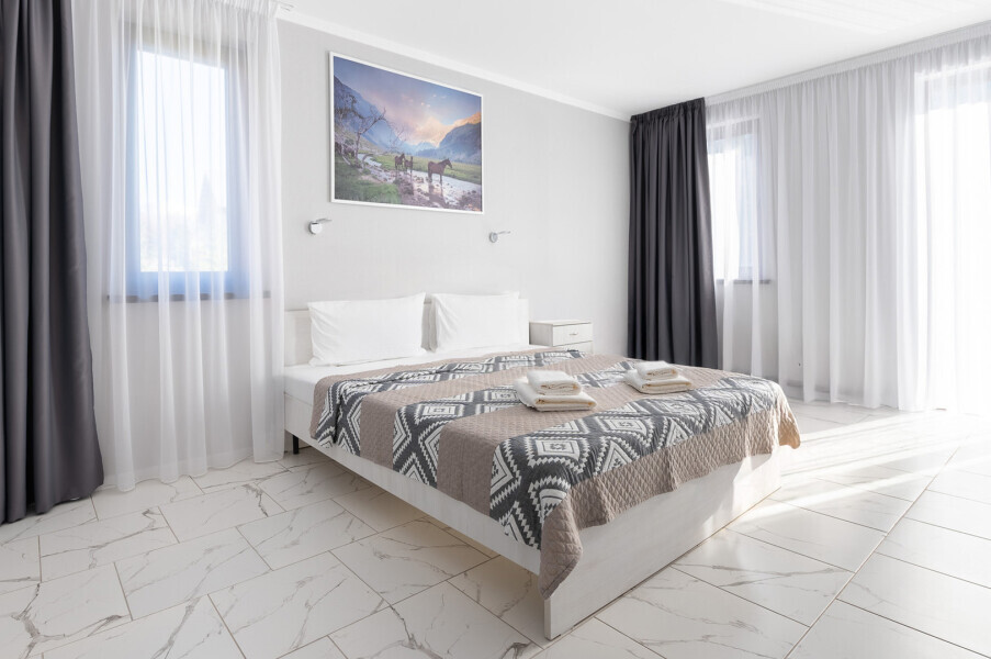 Для размещения подготовлено 50 номеров различных категорий: от стандартных и апартаментов до двухэтажного коттеджа. Интерьер выдержан в мягких спокойных тонах, везде размещена комфортабельная мягкая и корпусная мебель. В числе удобств бесплатный Wi-Fi, телевизор с плоским экраном, кондиционер, фен, халат и набор полотенец.