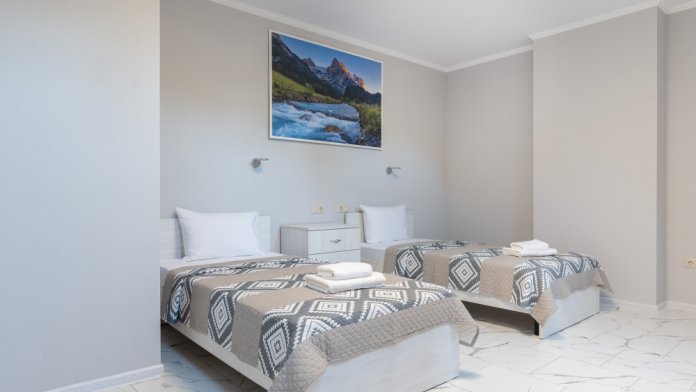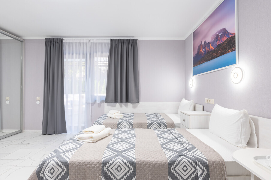 В номере: две односпальные или одна большая двуспальная кровать и диван-кровать.