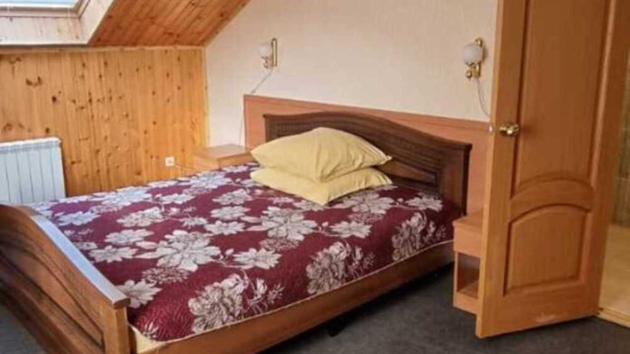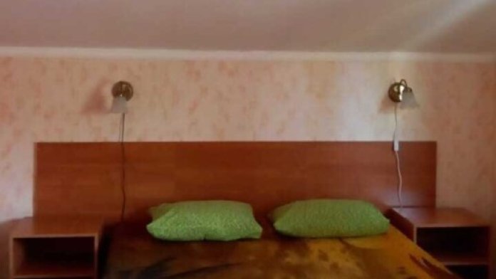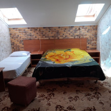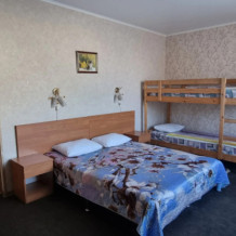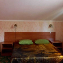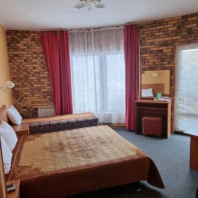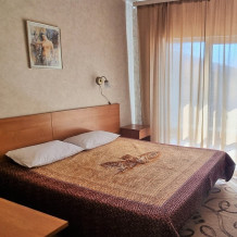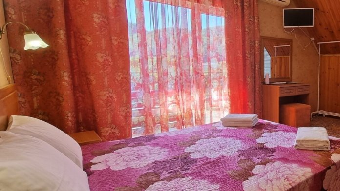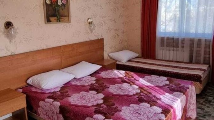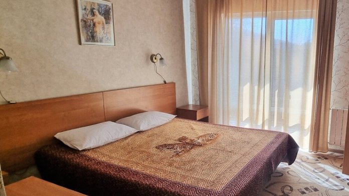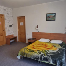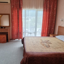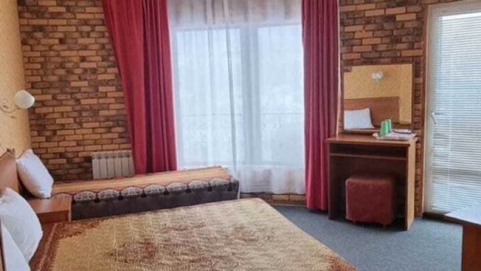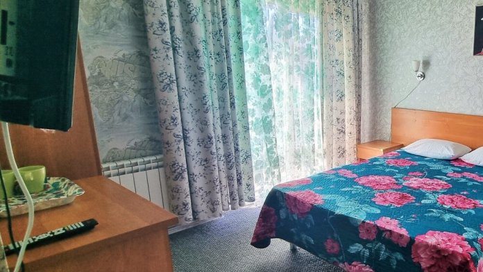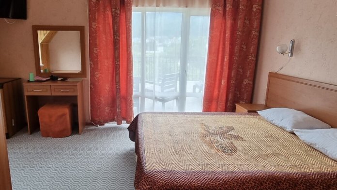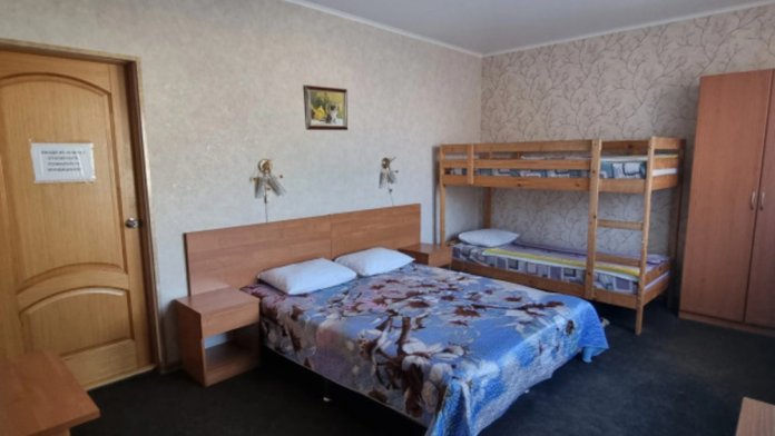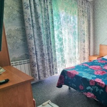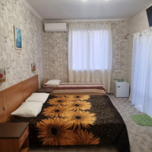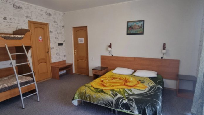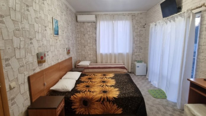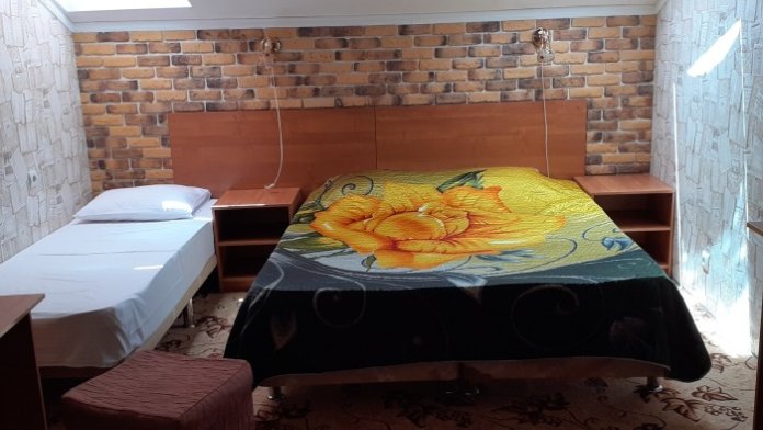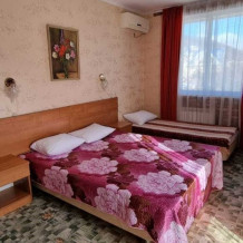 В номере: двуспальная и односпальная кровати, шкаф, стол, стул, тумбочки, телевизор, фен, кондиционер, холодильник на этаже.