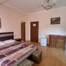 В номере: 2 комнаты - двуспальная кровать, 3 односпальные кровати, 2 телевизора, 2 кондиционера, холодильник, стол, туалетный столик, шкаф-гардеробная, тумбочки, пуфики, плотные занавески, фен, эркер. Санузел совмещенный с душем в номере. 1 этаж.