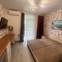 Небольшой уютный номер с полноценной кухней. В номере есть варочная поверхность, набор посуды, большой раскладной диван, балкон.