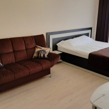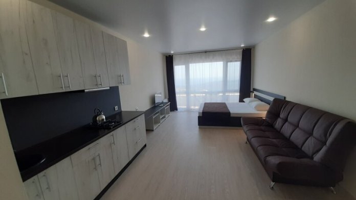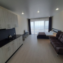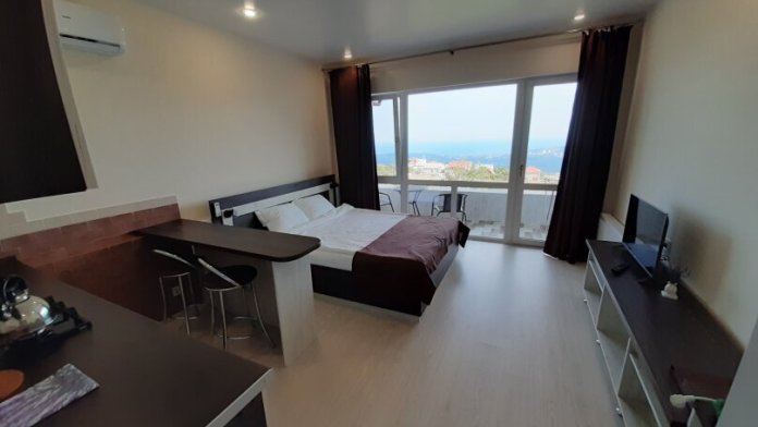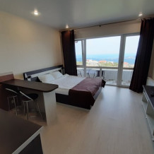 Апартаменты-студия с балконом, отопление. В студии одна большая двуспальная кровать и раскладной диван, для размещения до 4 человек (2 взрослых и 2 ребенка). Полностью укомплектованная кухня на 4 персоны. Постельное бельё, полотенца банные, полотенца для бассейна, косметика для душа, фен. Гладильные принадлежности. Холодильник. Стиральная машина. Сейф. Wi-Fi на всей территории, кондиционер, телевизор Smart TV.