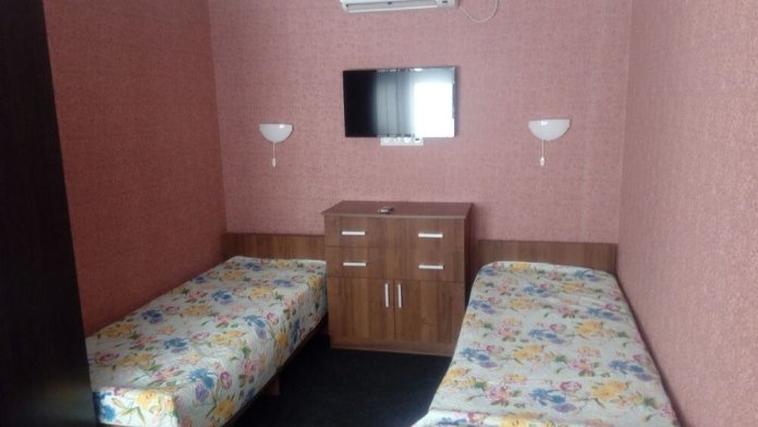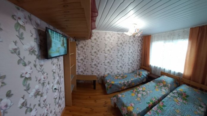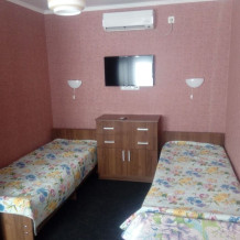 Трехместный номер эконом класса, расположен на 2 этаже двухэтажного здания, имеет выход на террасу с общей кухней и видом на море. В номере: три односпальные кровати, жк-телевизор, комод, шкаф, полка для обуви, зеркало, кондиционер (сплит). Для данной категории номеров санузел общий и находится на 1 этаже здания.