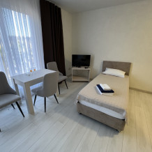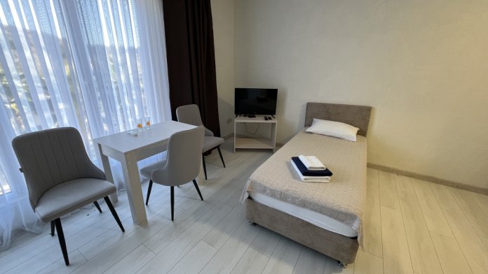 В номере есть все для Вашего удобства: комфортные спальные места, кондиционер, телевизор, шкаф, небольшой обеденный стол и стулья, собственная ванная комната с феном и туалетными принадлежностями.