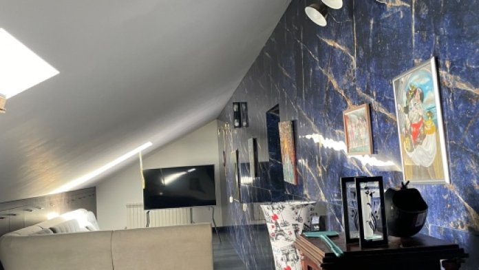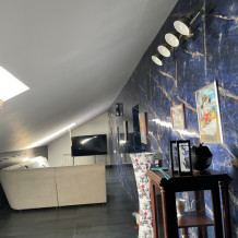 - Комната № 3. Мансарда со встроенными шкафами, окна-маркизы на скошенном потолке, раскладывающийся двухспальный диван, большой телевизор, антикварная витрина для посуды, пуф.