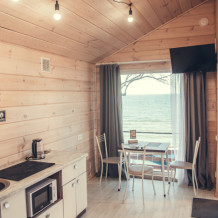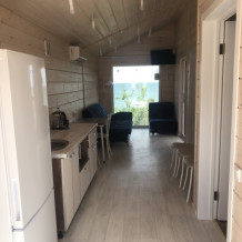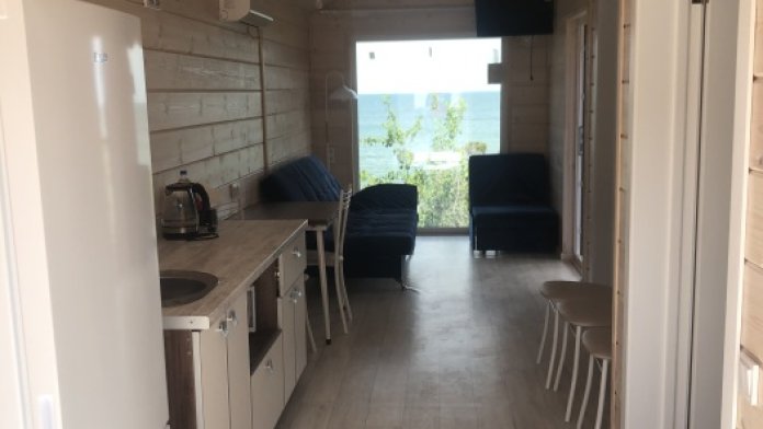В каждом домике есть терраса, кондиционер, плазма, мини-кухня (холодильник, микроволновка, столешница с встроенной раковиной ), чайник, посуда, переносной стол и стулья, шкаф для вещей, гардеробная, постельное и полотенца.