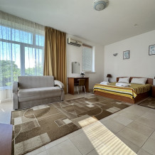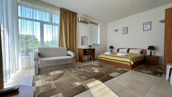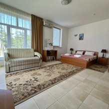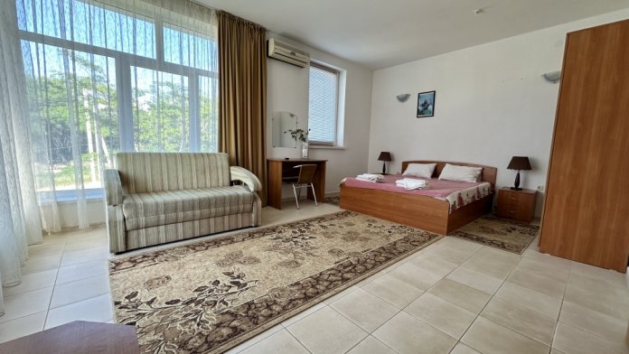В номере двуспальная кровать и раскладной диван. Также в номере есть небольшой кухонный уголок с раковиной, душевая кабина и туалет. Из бытовых приборов телевизор, холодильник и кондиционер.