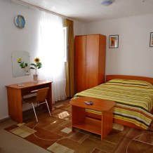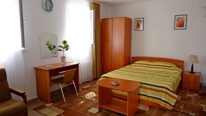 В основной комнате стоит двуспальная кровать, шкаф, столик. В маленькой комнате две односпальные кровати. Также в номере есть душевая кабина и туалет. Из бытовых приборов телевизор, холодильник и кондиционер. Перед номером небольшая беседка с мангалом.