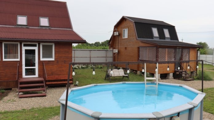На территории два отдельных дома, территория, бассейн, места для отдыха на свежем воздухе, хозблок, парковка - общие.
