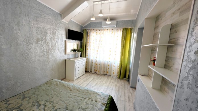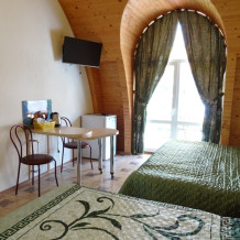 Эксклюзивный номер с террасой 60 кв.м. на втором уровне. Большой светлый номер с кухонной зоной, в нише 2сп.кровать. 2сп.диван и кресло-кровать, туалетный столик с зеркалом, обеденный стол, 2-х камерный холодильник, микроволновка, индукционная плита, эл.чайник набор посуды и кастрюль. На балконе сушилка для белья. На террасе закрытая башенка , открытая беседка с освещением и эл.розетками , 4 шезлонга для отдыха. Вид с террасы на 360», горы, море, город.