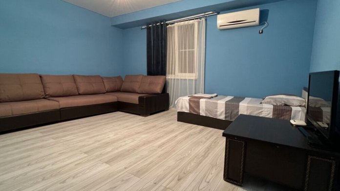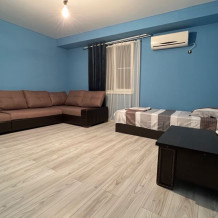 Вмещает она до 10 человек включительно, три спальных комнаты и лоджия и два балкона, кухня, ванная комната с санузлом, всегда есть горячая и холодная вода, стиральная машина, Wi-Fi.