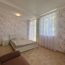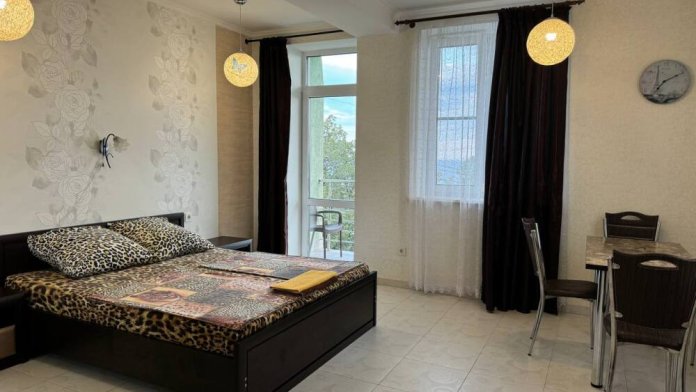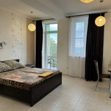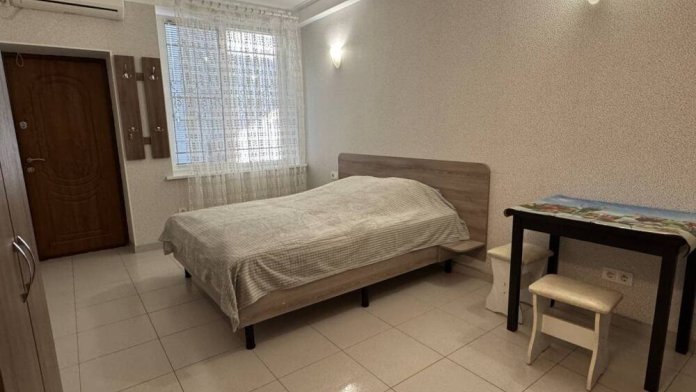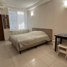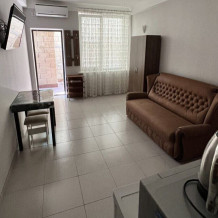 Квартира-студия с кухней и санузлом. В санузле находятся душевая кабина, бойлер, раковина, зеркало, стиральная машина-автомат, унитаз, фен. Номера стандарт находятся на первом этаже гостевого дома. В номере большое окно с видом во двор. Возле номера есть своя зона отдыха с деревянным столом, лавочками, Wi—Fi, и сушилкой для морских принадлежностей.