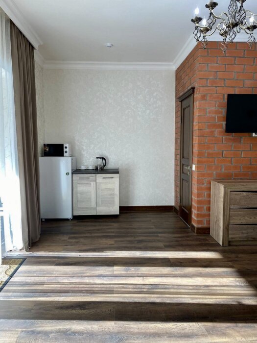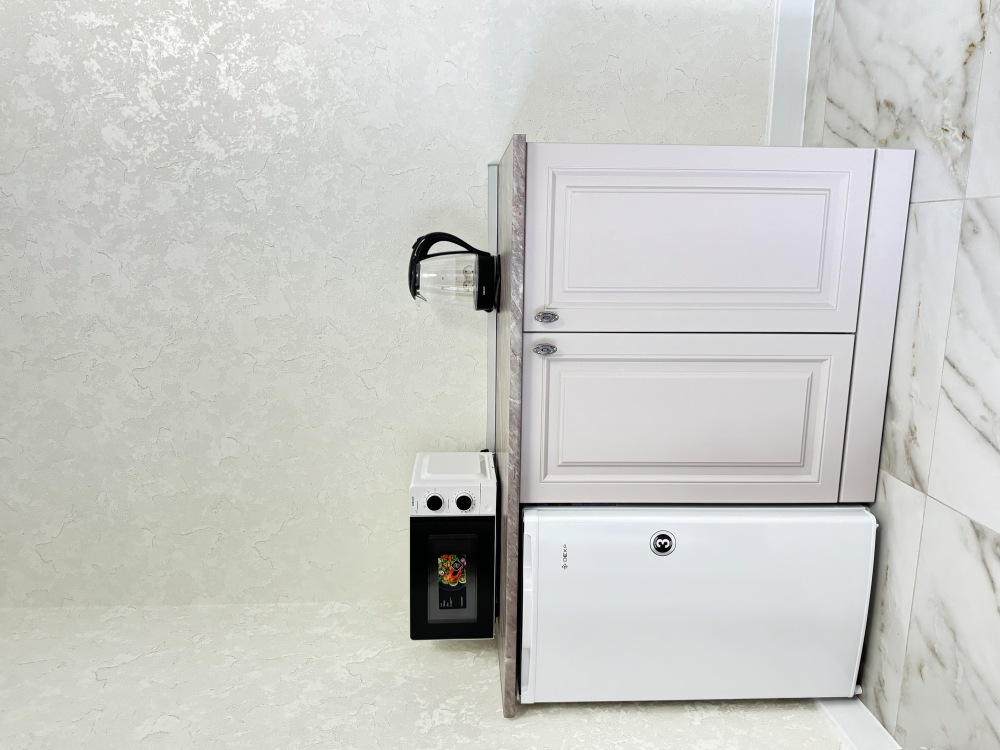 - оборудованная кухня с холодильником, микроволновой печью, чайником, посудой и столовыми приборами;