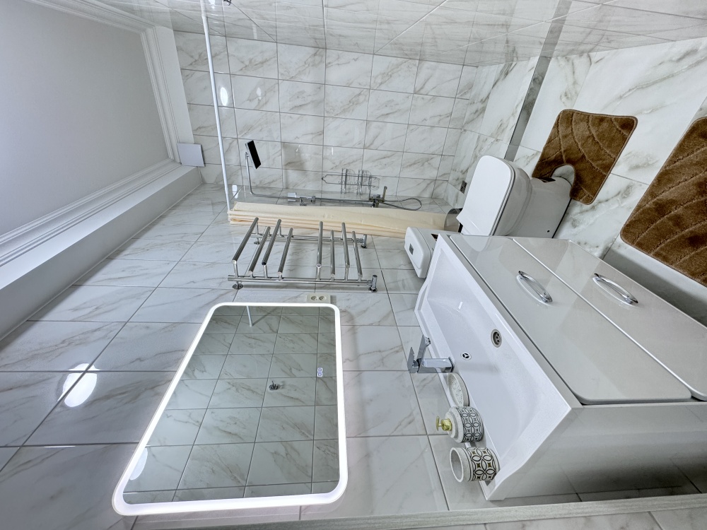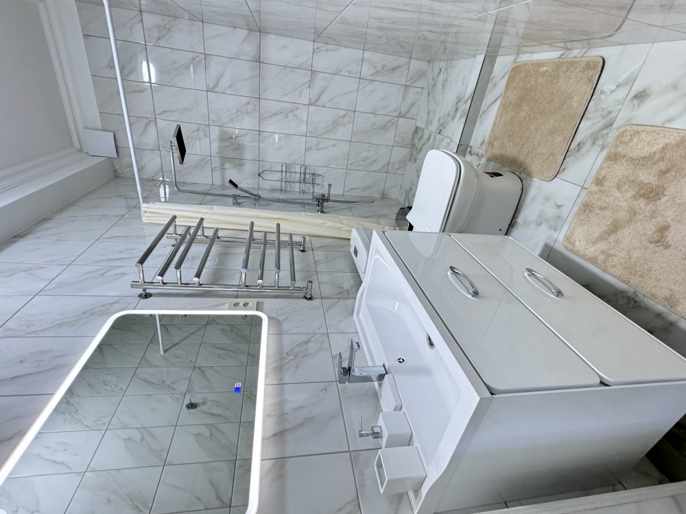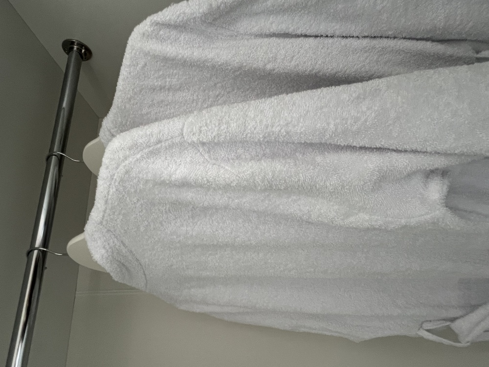 - ванная комната с полотенцами, тапочками и косметическими принадлежностями.