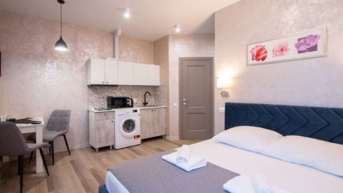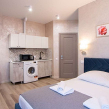 Апартаменты с кухней, где могут расположиться до 2 гостей на комфортной ортопедической кровати. В апартаменте есть все необходимое для комфортного проживания, хорошая звукоизоляция. Имеется парковка. Остановки автобусов на расстоянии 50 метров.