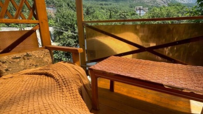 Зелёный закрытый двор, беседка с видом на море и горы, бассейн, мангал, парковка.