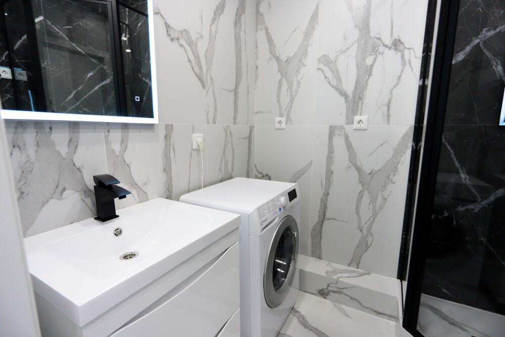 Имеется телевизор, кондиционер, шкаф, зеркало, обеденный стол, журнальный стол, кухня, посудомоечная машина, чайник, холодильник, микроволновая печь, электроплита, стиральная машина, гладильные принадлежности.