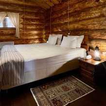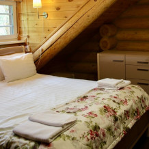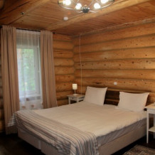 2-местный номер первой категории в отдельно стоящем доме из рубленного бревна в месте, отдаленном от основной территории, выполненный в стиле охотничьего зимовья. Неповторимый колорит изящной французской печи-буржуйки и поленница с дровами. Комплектация номера: двуспальная кровать или две односпальные кровати, прикроватные тумбочки со светильниками, кофейный стол, два стула, французская печь-буржуйка, санузел с душевой кабиной, косметическое зеркало, тапочки и халаты.