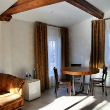 Комплектация номера: диван, журнальный стол со светильником, два кресла, письменные принадлежности. Спальня: двуспальная кровать или две односпальные кровати, прикроватные тумбочки со светильниками, кофейный стол, два стула, санузел с душевой кабиной. Зона отдыха: косметическое зеркало, тапочки и халаты. Санузел с душевой кабиной.