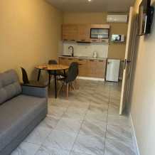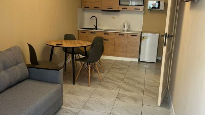 На территории небольшой дворик с местами для отдыха на свежем воздухе, с уличной мебелью. К услугам гостей уютные апартаменты с мини-кухней и всем необходимым для комфортного отдыха и проживания. В каждом номере: телевизор, Wi-Fi, холодильник, кондиционер, варочная панель, вытяжка, мойка, посуда, стол, стулья, диван (два спальных места), отдельная спальня на двоих кровать, шкаф, фен, а так же санузел.