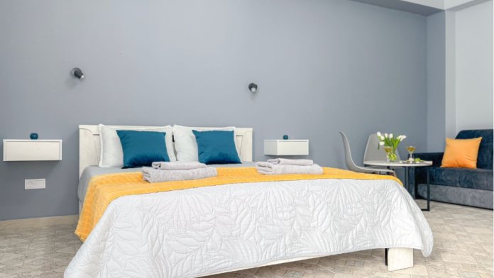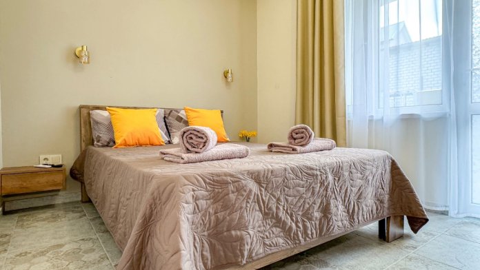 Комфортабельный номер люкс с двуспальной кроватью, удобным диваном, который раскладывается в двуспальное место, зоной для чаепития. Номер оснащен сплит-системой, холодильником, чайником, СВЧ-печью, ЖК смарт ТВ 43 дюйма. В ванной комнате тропический душ.