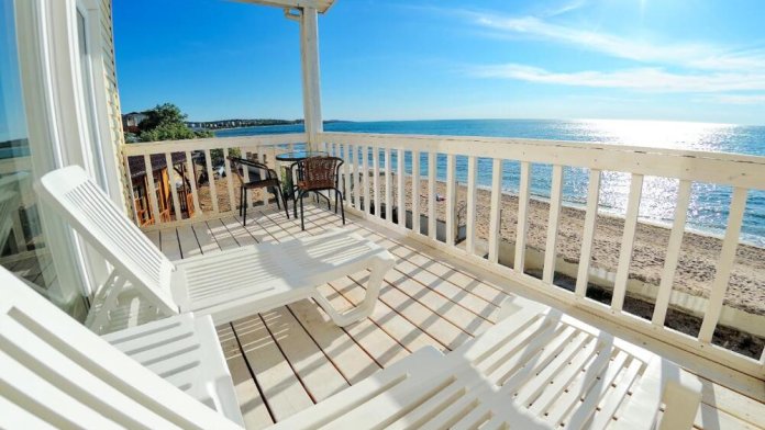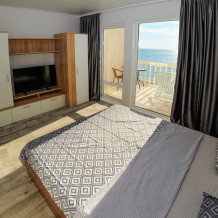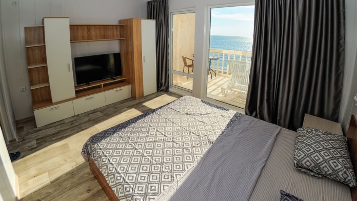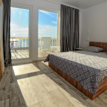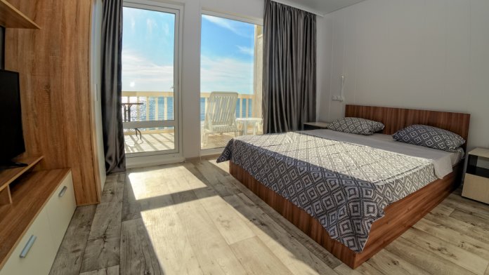 Новый 3-х комнатный номер Люкс с видом на море. Номера расположены по второй береговой линии на втором этаже, в 10 метрах от пляжа. Номера оснащены всем необходимым для комфортного семейного отдыха ( кухня с кухонными принадлежностями, стиральная машинка, Smart TV , двуспальная кровать, 2 односпальных кровати и двуспальный раскладной диван). Отличный вариант для большой семьи ( вместимость 6 человек). При номере просторная видовая терраса с садовой мебелью.