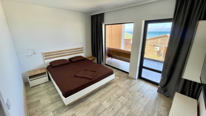 Новый 3-х комнатный номер Люкс . Номера расположены по второй береговой линии на первом этаже, в 10 метрах от пляжа. Номера оснащены всем необходимым для комфортного семейного отдыха ( кухня с кухонными принадлежностями, стиральная машинка, Smart TV , двуспальная кровать, 2 односпальных кровати и двуспальный раскладной диван). Отличный вариант для большой семьи ( вместимость 6 человек). При номере просторная видовая терраса с садовой мебелью.