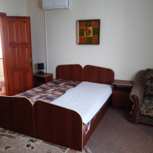 Номер в новом корпусе, состоящий из одной жилой комнаты с 2-местной кроватью и кресло-кровать, душевая, с полным санузлом (душ, умывальник, унитаз), рассчитанный на проживание трех человек. 2 этаж. Вид на сад и на море.