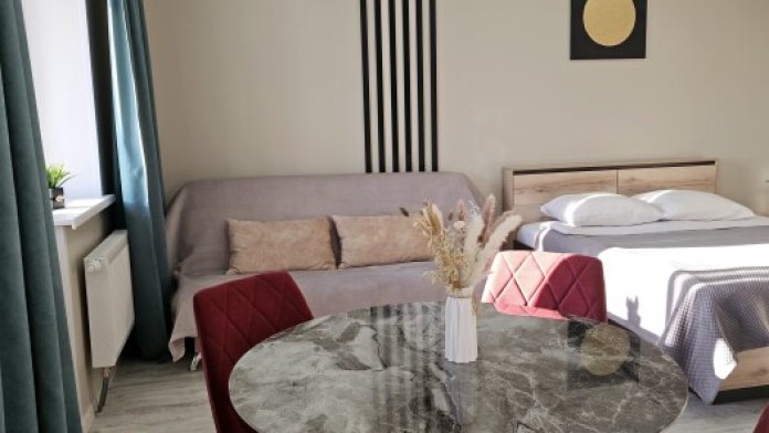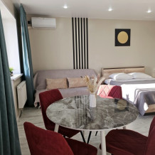 Светлая и просторная квартира полностью обустроена для приятного отдыха комфортабельной мебелью. В число удобств так же входит бесплатный Wi-Fi, ЖК-телевизор, кондиционер и балкон, широкая двухспальная кровать и раскладной диван. Собственная ванная комната оборудована душем и стиральной машиной.