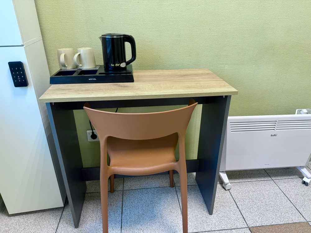 В общих зонах на 2 этаже есть кухня с холодильниками, микроволновой, индукционной плитой (можно варить и жарить), кастрюли, сковородки, казан, питьевая вода (обратный осмос), всё необходимое для приготовления и употребления пищи. Так же есть комната отдыха с 4к телевизором множеством фильмов, сериалов, телеканалов и Youtube.