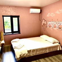 Апартаменты вмещают 3-4 человека. Имеется кабельное ТВ, кондиционер, холодильник, микроволновая печь, плита, чайник, стиральная машина, двухместная кровать (2м*2м), кресла-кровати (одно-двухместные), необходимая мебель, принадлежности, собственный санитарный узел (душ, туалет) в апартаментах и прочее. Во дворе под навесом расположена зона барбекю, а также имеется кухня со всеми необходимыми принадлежностями для приготовления и приема пищи.