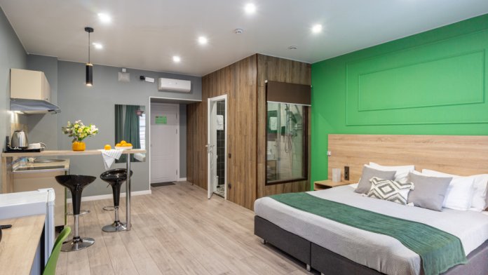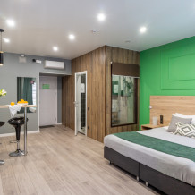 В номере: двуспальная кровать, прикроватные тумбочки, стол, стулья, шкаф ЖК-телевизор, кондиционер, телефон, сейф, мини-кухня, электрический чайник, микроволновая печь, электрическая варочная панель, мини-бар, душ, туалет, фен, отопление, звукоизоляция, кухонные принадлежности, туалетно-косметические принадлежности, постельное белье, полотенца, тапочки, вешалки для одежды, подключение к кабельному и цифровому телевидению, доступ к беспроводной сети WI-FI.