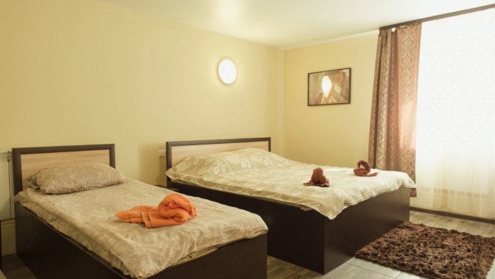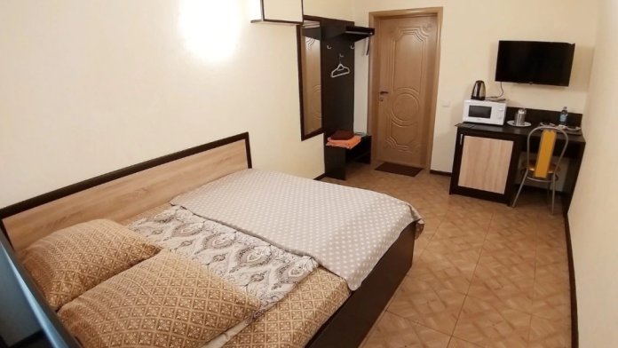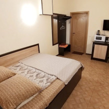 В номере одна двуспальная кровать или две односпальные. Есть микроволновая печь.