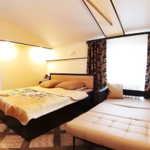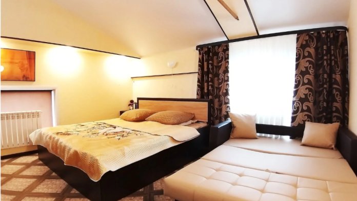 В номере: кровать King size, раскладной диван или две одноместные кровати по 90 см. Есть микроволновая печь.