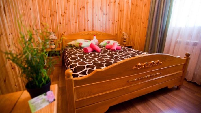 Номер «Малиновый рай»- уединённый, романтичный номер. Мебель сделана из дуба ручной работы. Номер находится на 1-м этаже, подойдёт для всех желающих отдохнуть у нас. Мы называем его универсальным, из-за его расположения часто пользуется спросом. Душ и туалет общие на два номера, на этаже.