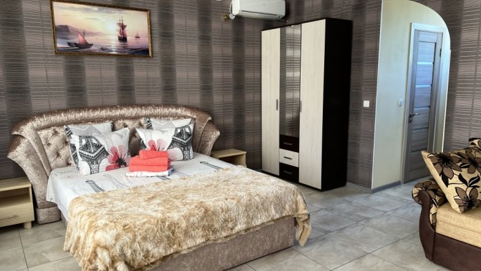Апартамент «Афродита»- шикарный, просторный, комфортный апартамент. «Афродита» имеет свой отдельный вход, большую спальную комнату, кухню выполненную из дерева, также прихожую и кладовую. Особое внимание хочется уделить ванной комнате, её дизайн выполнен в нежно сиреневый цвет, что даёт ощущения прохлады, чистоты, умиротворения. Имеет своих постоянных клиентов, рекомендуем бронировать не менее, чем за пол года до заезда, чтобы пожить в апартаментах, как Афродита.