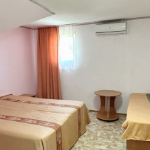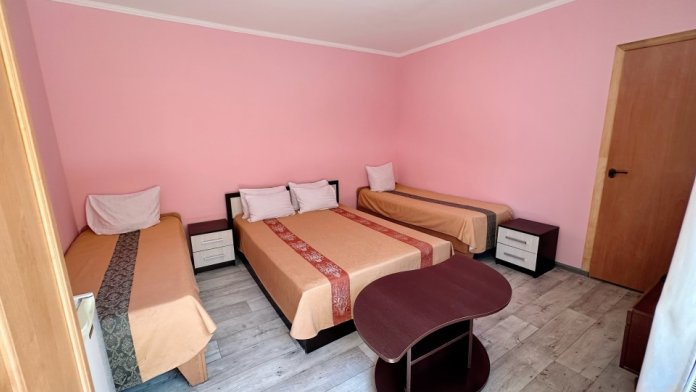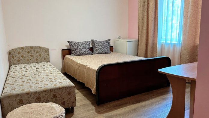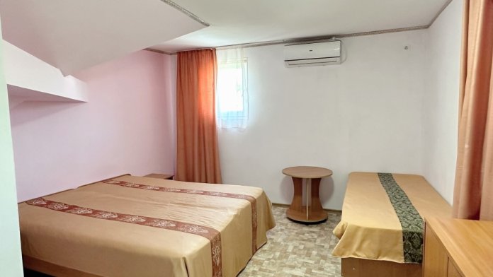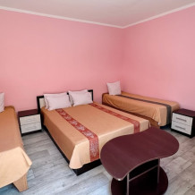 Однокомнатный номер с одной двухспальной и двумя односпальными кроватями. Расположен на первом этаже.