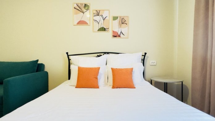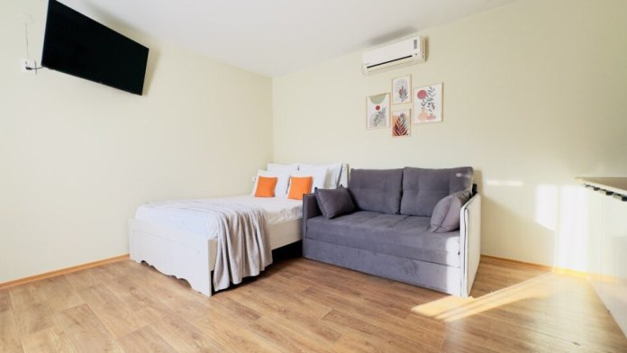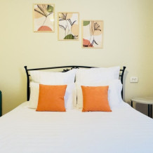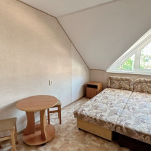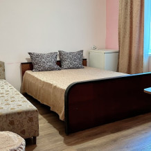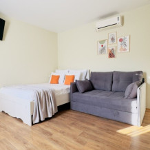 Однокомнатный уютный номер с одной двуспальной кроватью и раскладным диваном. Расположен на втором этаже. Идеально подходит для семейного отдыха и длительного проживания.