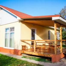Дом на берегу с витражным обозрением реки (80 кв.м): 2 комнаты с 2 кроватями (1,2 м), 1 комната – диван (двуспальный), дополнительно 2 кресло-кровати. Кухня «как дома»: большой холодильник с морозилкой, газовая плита с духовым шкафом, микроволновая печь, электрический чайник, посуда для приготовления и подачи еды. В прихожей имеется встроенная система хранения, санузел объединённый. Собственная просторная терраса оснащена большим столом и 2-я скамьями. Морозильный ларь 200 л