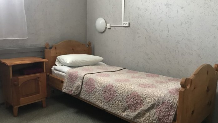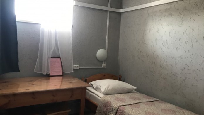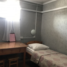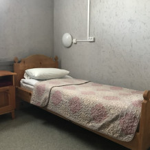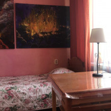 Одноместный номер эконом-класса расположен на цокольном этаже гостевого дома. В комнате кедровая кровать, белое белье, полотенце. Полки для одежды, стол, кедровый стул - кресло. Туалет, душ — на этаже. В комнате небольшое окно. Вид из окна на территорию гостевого дома. Стены украшены картинами американской художницы К.Хилтон. Можно воспользоваться общей кухней или заказать питание