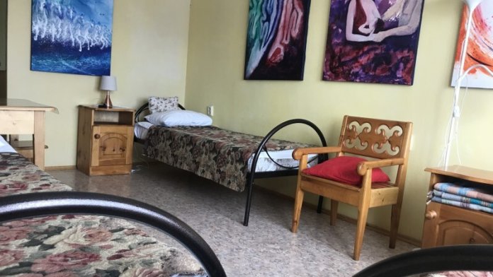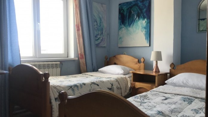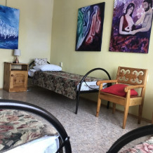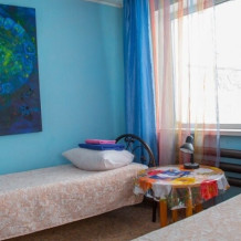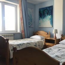 Трехместный номер класса эконом расположен на втором этаже гостевого дома. В комнате три кедровые кровати, белое белье, полотенца. Тумбочка и полки для одежды, стол. Туалет рядом с комнатой. В других комнатах на этаже есть свои туалеты. Душ на первом этаже. Стены украшены картинами американской художницы К.Хилтон. Можно воспользоваться общей кухней или заказать питание.